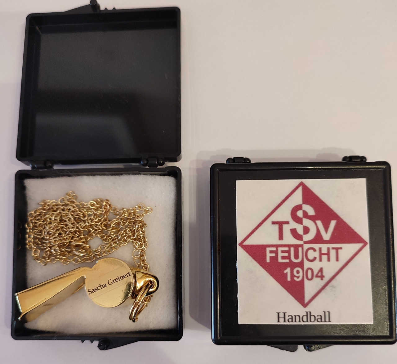 Um das Ziel zu erreichen und als Anreiz, gab es für die beiden ein kleines Dankeschön von den Minitrainern. Nach einer Trainingseinheit, wurde beiden eine goldene Schiedsrichterpfeife im Etui überreicht.