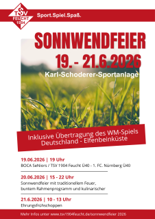 Es ist wieder soweit! Vom 19. bis 21. Juni 2026 lädt der TSV 1904 Feucht herzlich zur großen Sonnwendfeier auf die Karl-Schoderer-Sportanlage ein. Freut euch auf ein Wochenende voller sportlicher Highlights, geselligem Beisammensein und traditioneller Bräuche.