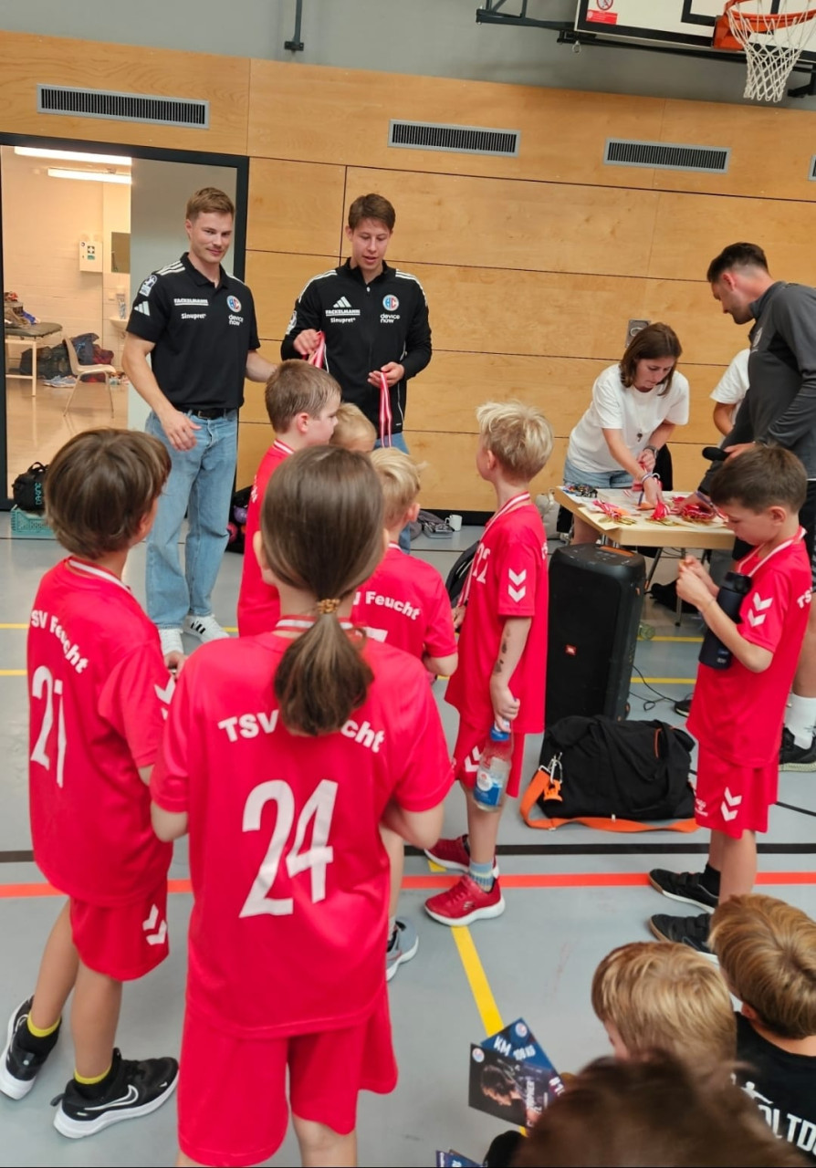 Höhepunkt für die Kleinsten: Profis hautnah Ein ganz besonderes Erlebnis wartete nach den Spielen: Bei der feierlichen Siegerehrung erhielten alle Kinder Medaillen – überreicht von Christopher Bissel und Florian Scheerer, den Bundesliga Spielern des HC Erlangen. Das war nicht nur ein toller Abschluss für den Turniertag, sondern auch eine große Motivation für alle jungen Talente. Krönender Bonus: Jeder Teilnehmer bekam Freikarten für das Heimspiel des HC Erlangen gegen den THW Kiel Ende August.