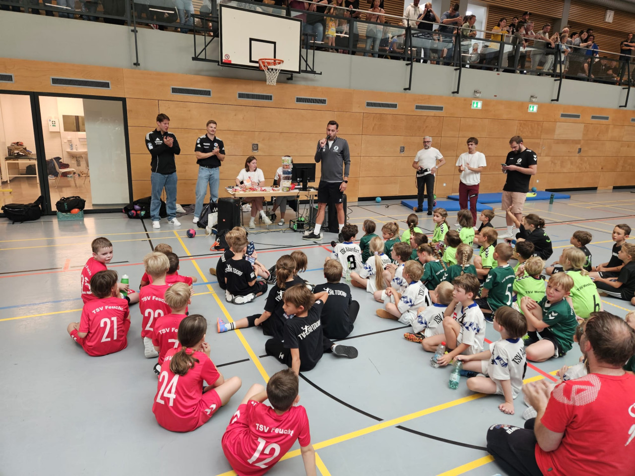 Für die TSV Feucht Minis verlief das Turniertag am Samstag trotz kurzfristiger Anpassungen äußerst erfolgreich. Aufgrund des unbeständigen Juli-Wetters traten die Feuchter Nachwuchsspieler diesmal nur mit einer Mannschaft an. Dabei setzte sich das Team spontan zusammen aus Spielerinnen und Spielern der regulären M1- und M2-Teams. Die Kinder zeigten in der Halle – denn wetterbedingt wurde das geplante Rasenturnier für die Minis und E-Jugend kurzfristig nach drinnen verlegt – großartige Leistungen. In drei emotionalen und spannenden Partien spielten sie engagiert und clever auf, passten sich schnell der neuen Zusammensetzung an und gingen motiviert in jedes Spiel.